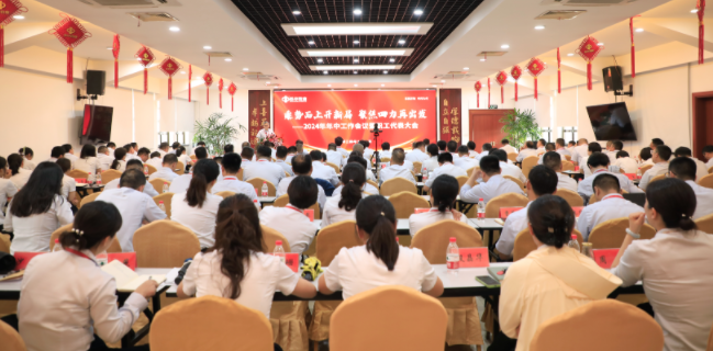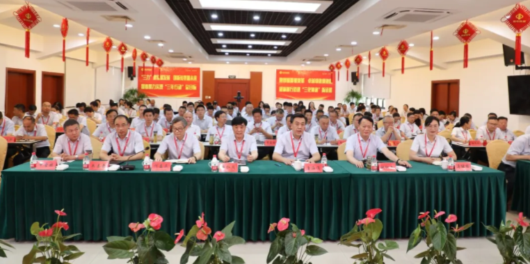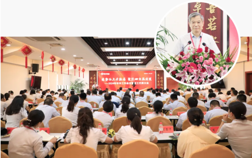 骄阳如火照天,黄葵盛开映地。7月8日,集团公司2024年年中工作会议暨职工代表大会在行政楼三楼会议室八隆重召开。大会采用“主会场+分会场”现场直播形式,集团公司主管以上人员及职工代表分别于6个会场参会。会议由集团公司副总经理何益民主持。
