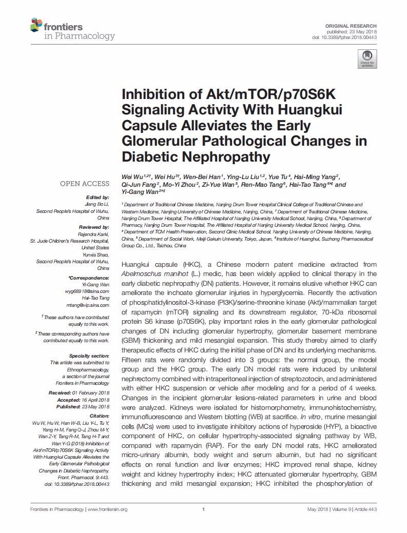 近日,《Frontiers in Pharmacology》(2019年影响因子4.225)刊登黄葵胶囊抑制AKT/mTOR/p70S6K信号通路活性减轻糖尿病肾病的早期肾小球病理改变的基础研究文章,该项研究证实了安全有效剂量为2g/kg/day的黄葵胶囊不仅可以改善尿微量白蛋白和肾脏肿大,而且可以缓解糖尿病肾脏疾病模型大鼠的早期肾小球病理改变,率先提供了黄葵胶囊直接有助于预防早期糖尿病肾脏疾病发生的证据。